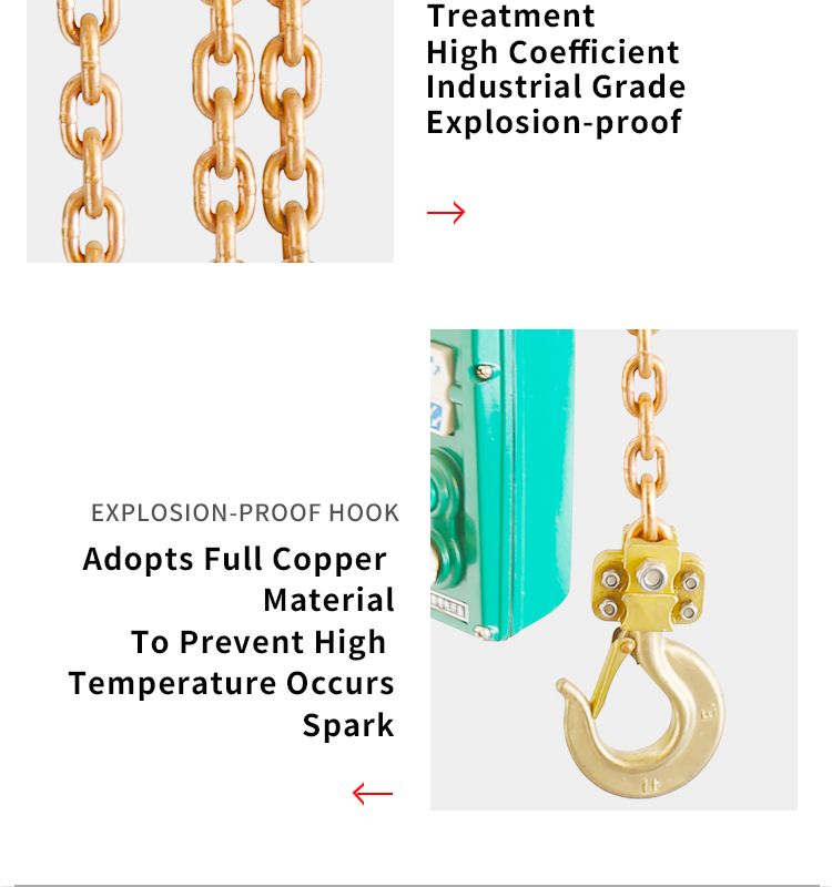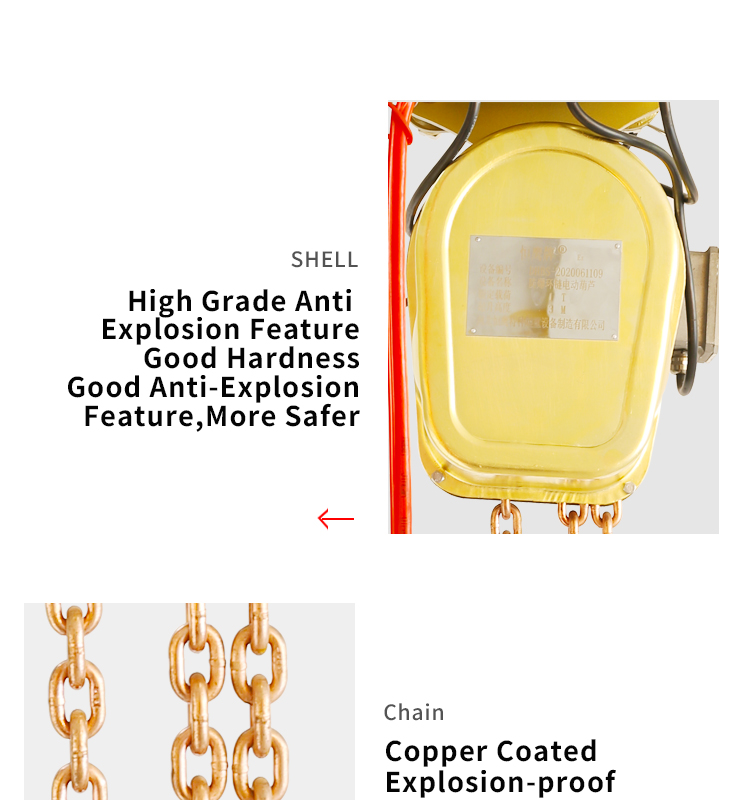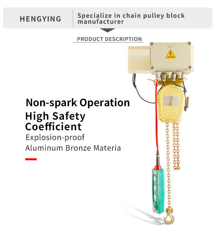 The explosion-proof electric chain hoist is an explosion-proof lifting equipment designed and manufactured by my country's new explosion-proof standard. Its explosion-proof form is "explosion-proof". The exposed explosion-proof parts of the hoist are made of special non-sparking materials, and the explosion-proof performance is safe and reliable. The product has passed the explosion-proof performance test of the Explosion-proof Electrical Product Quality Supervision and Inspection Center of the Ministry of Machinery Industry, and issued an explosion-proof certificate. It is mainly divided into explosion-proof wire rope electric and explosion-proof electric chain hoist. HHBD/DHBS-ZH/DHBT/DHBK explosion-proof electric chain hoist, specifications and sizes can be customized!