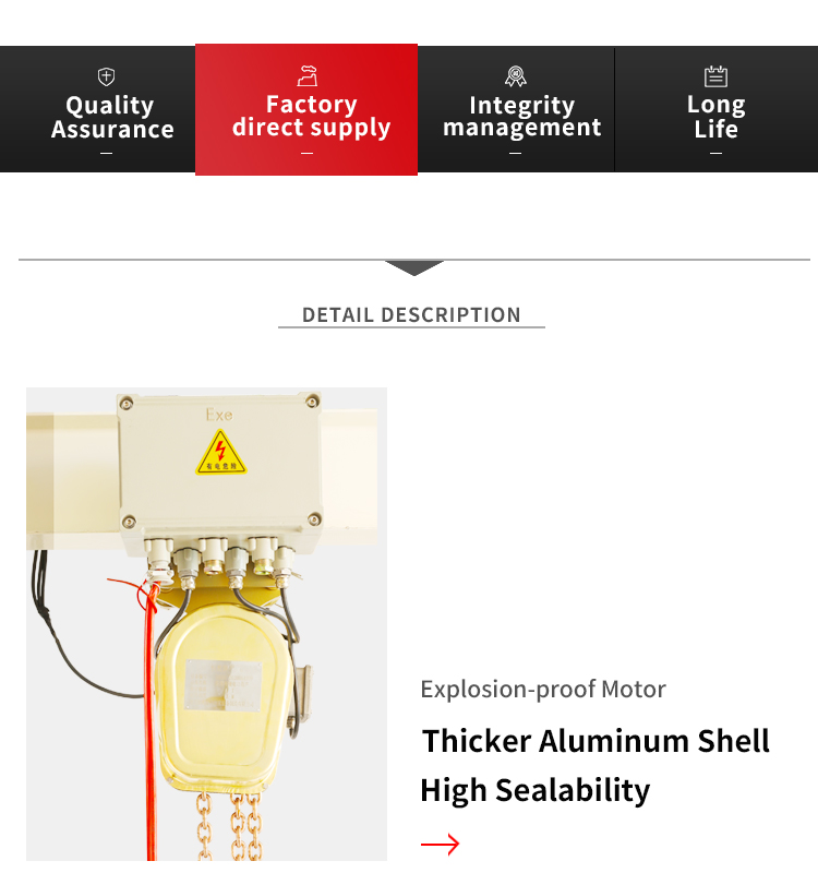 2. The explosion-proof motor and explosion-proof control box are separate explosion-proof structures. The control buttons, limit switches, and explosion-proof lifting weight limiter all meet the corresponding explosion-proof requirements.