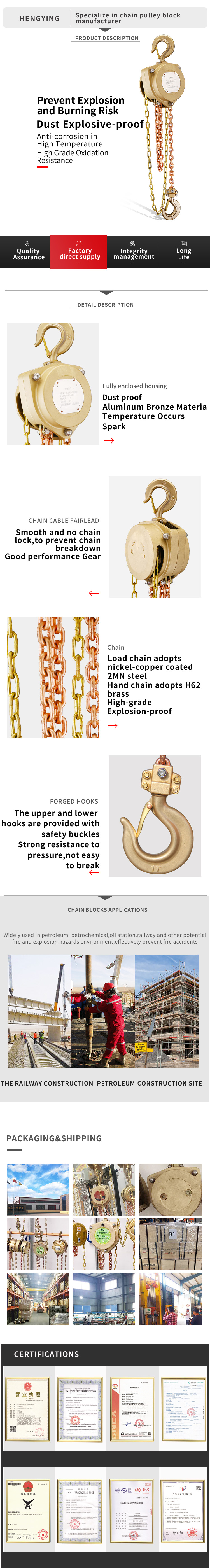 The explosion-proof chain hoist is made of aluminum bronze and beryllium bronze, and the outer casing of the chain hoist is made of H62 copper alloy. Forced friction parts include lifting wheels, hand chain wheels, wall plates, hooks, gears, and gear shafts that make up the chain hoist using aluminum bronze and beryllium bronze alloy materials. The product is safe and reliable, the design is advanced, and the chain wear will not cause adverse reactions such as sparks and explosions!