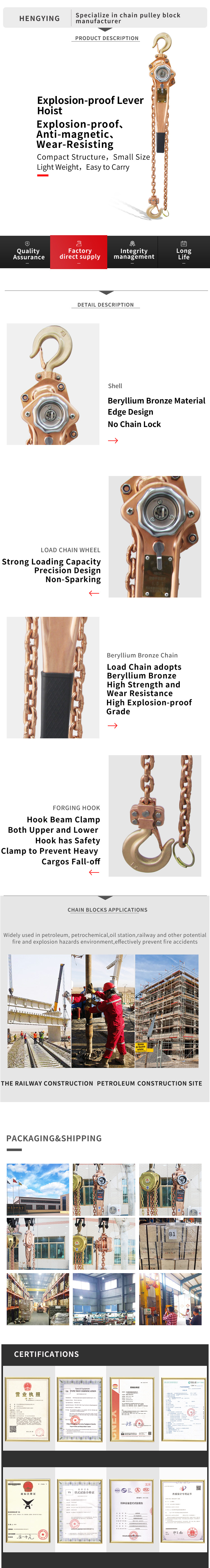 Product brand: Hengying Category: Explosion-proof lever hoist Material: H62 brass, aluminum bronze, nickel-plated copper alloy Supply mode: factory direct sales Manufacturer: Hengying special lifting